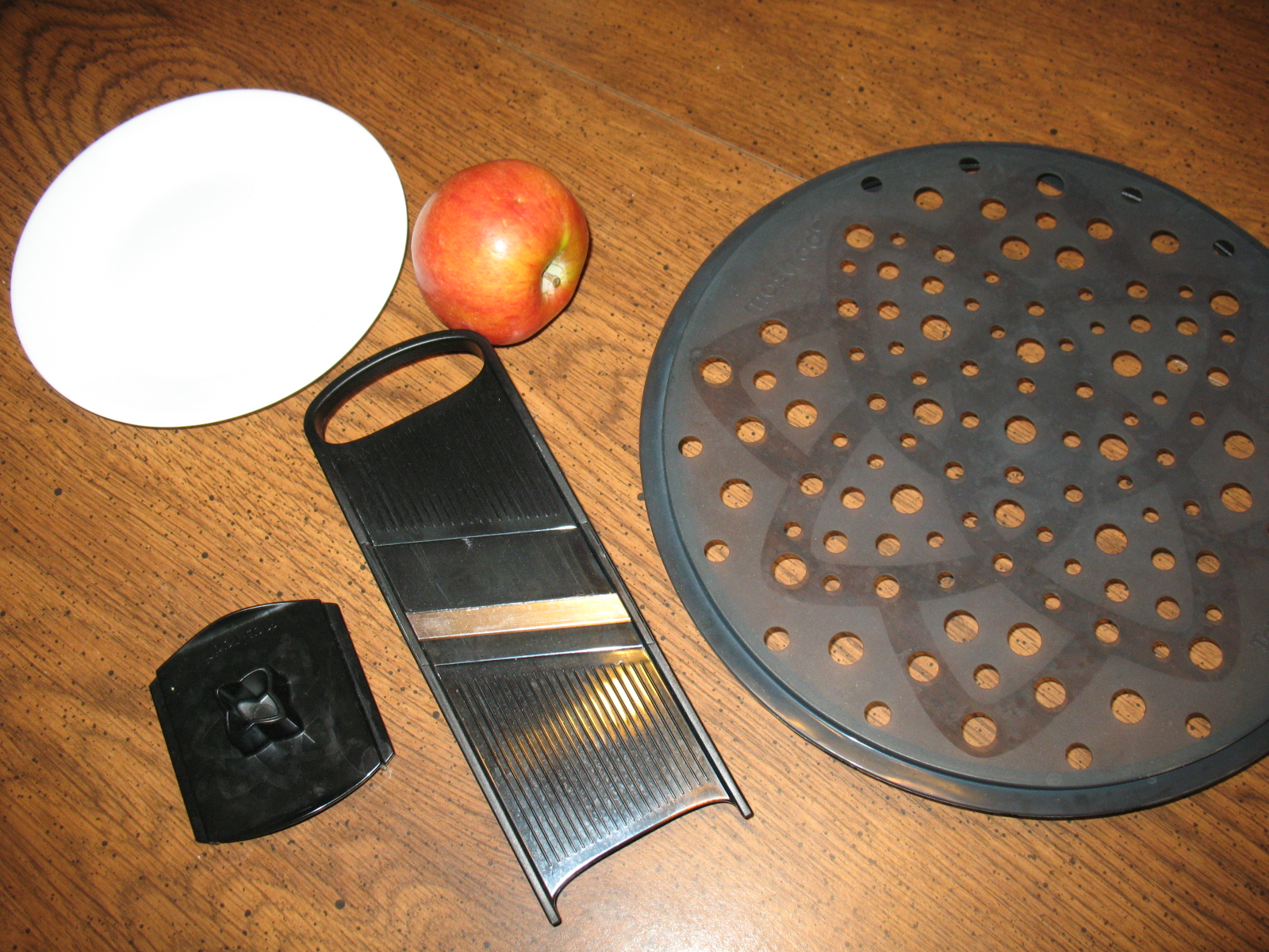 I saw it was even featured on Dr. Oz today as a healthy gadget for under $30. The Mastrad TopChips comes with one tray, care guide, food pusher, and mini mandoline (slicer). The slices produced are 1 mm thick. The use and care guide has eight recipes that are for healthy foods, not all using TopChips. You can also order it through TopChips with what looks to be a few extras, like seasonings.