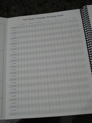 It has a master schedule that breaks down into half hr blocks to write in “regular” weekly activities for each season.  It is recommended to fill in with pencil because there could be some changes made later in the season.