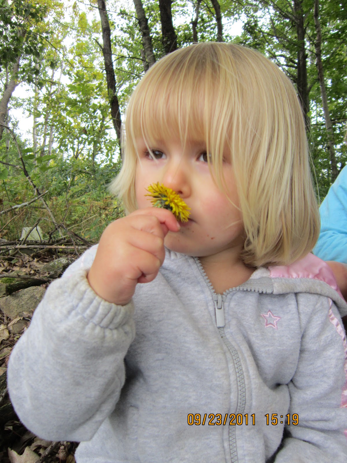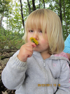 | Jayden smelling hopefully one of the last dandelions of the year. She is the middle child at 2, nearing 3. |