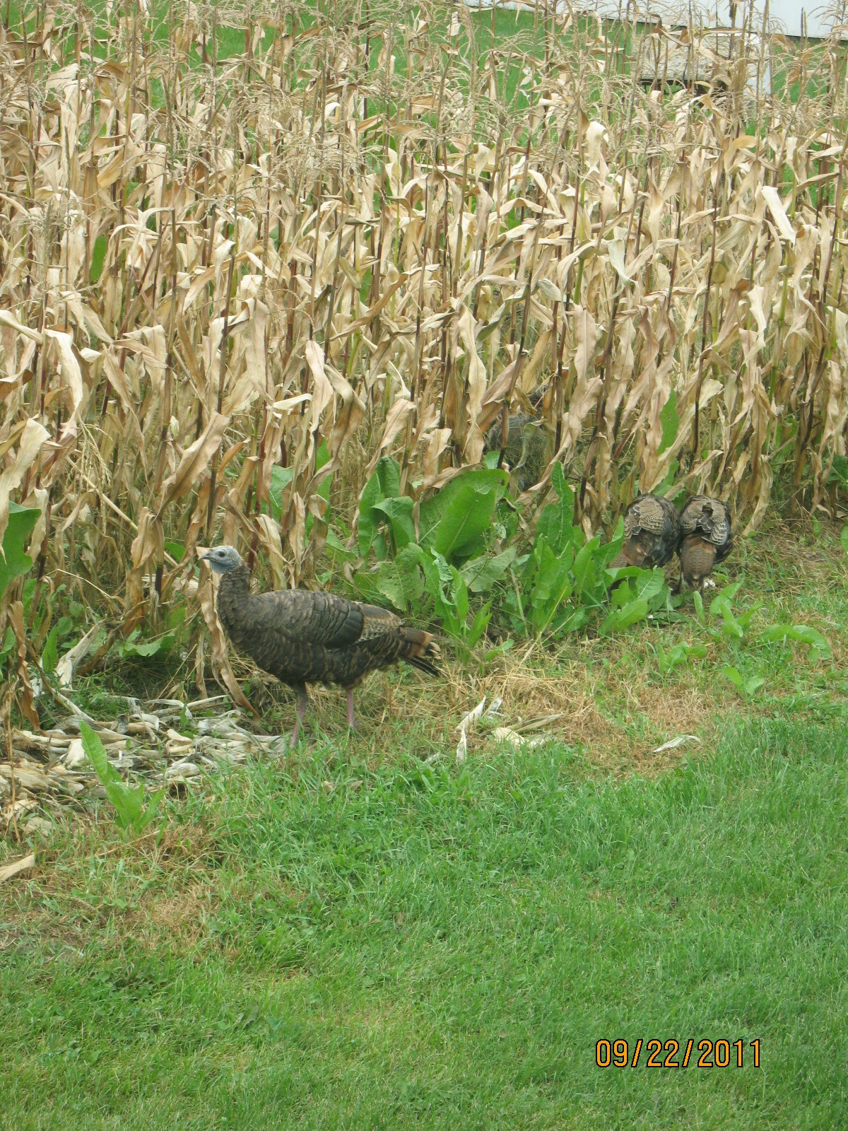 We have had wild turkeys in the yard almost daily for probably at least the last month. They are fun to watch. It has usually been one or two female turkeys, hens, with what might have been poults, baby chicks, from this spring. The most we have seen together is twelve.