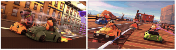 The karts are customizable and the power-ups feature some of Garfield’s favorite foods pet themed items like food bowls, cannon balls, space bubbles, and more.