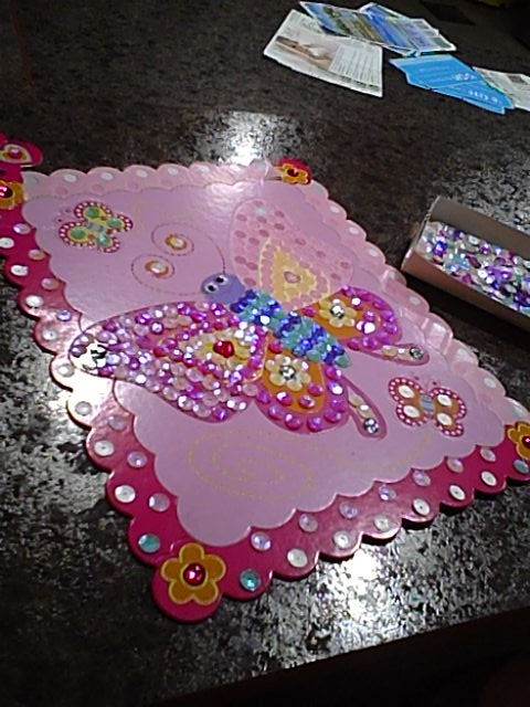 | Completed board from Girly Garden collection, wax crayon, and tray of sequins and gems to use |