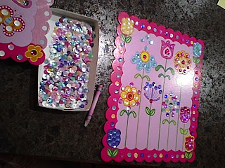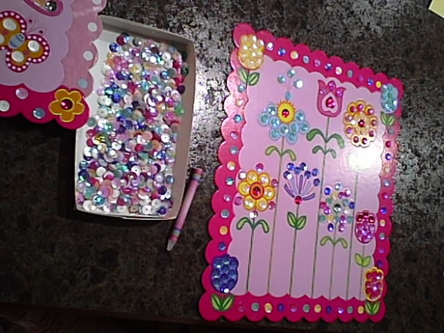 Completed board from Girly Garden collection, wax crayon, and tray of sequins and gems to use
