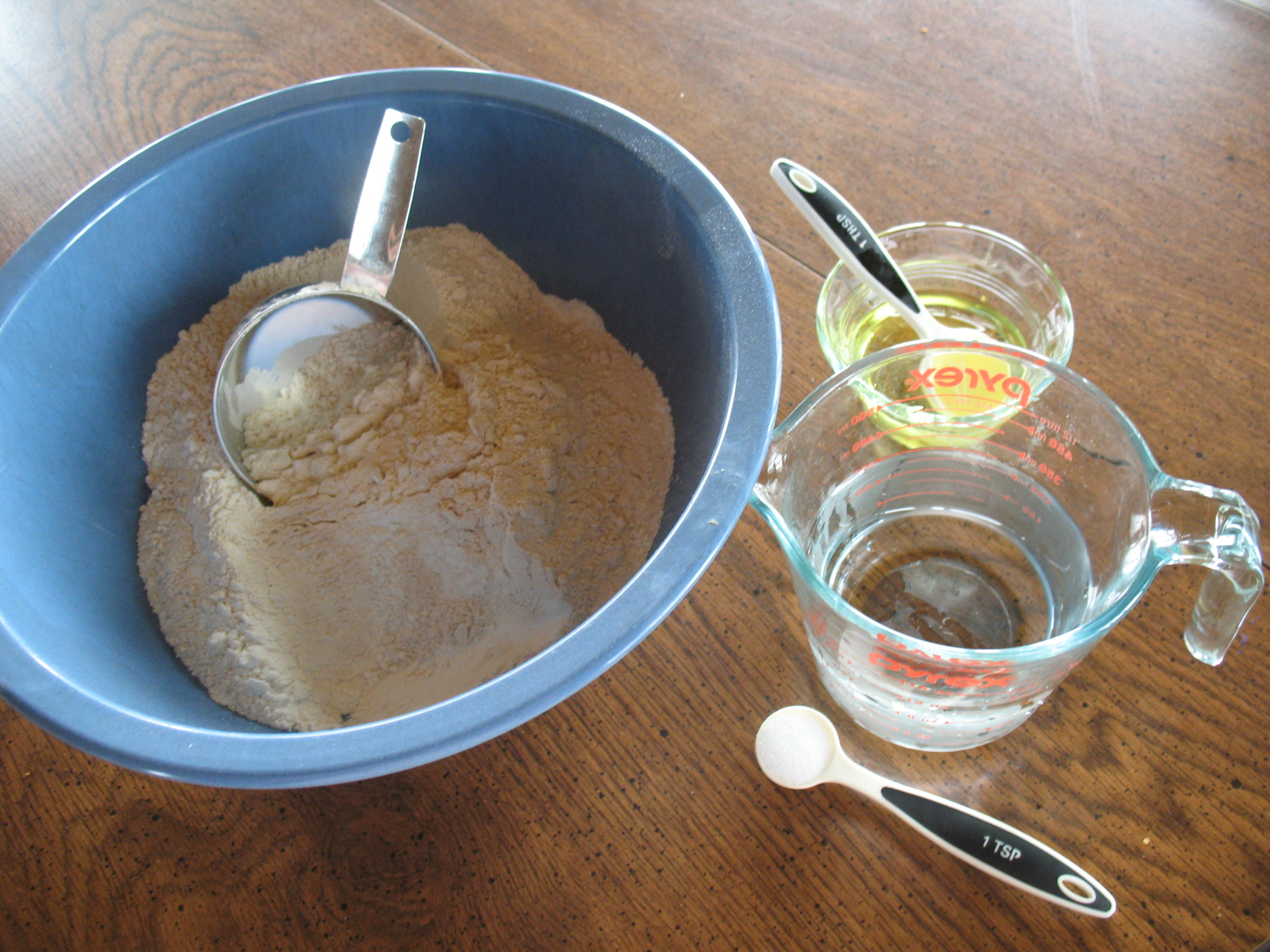 • In a large bowl, combine flour and salt.  Stir in water and oil.
