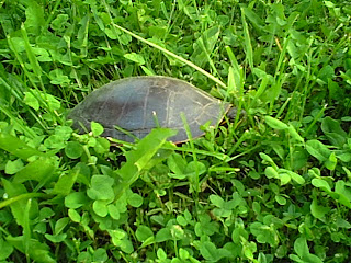 At the end of last week, Jeff, noted two painted turtles in the yard. I forget how we usually see turtles in June, coming in to lay their eggs. These gals had not been out of the water long before traveling through the yard. They still had live leeches on their shells.