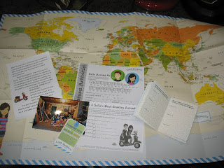 The adventure begins with this little suitcase and a letter from the two characters who take part in traveling the world, Sam and Sophia. There is also a world wall map and with consecutive kits, your child would be sent stickers to put on the map and track where Sam and Sophia have been.