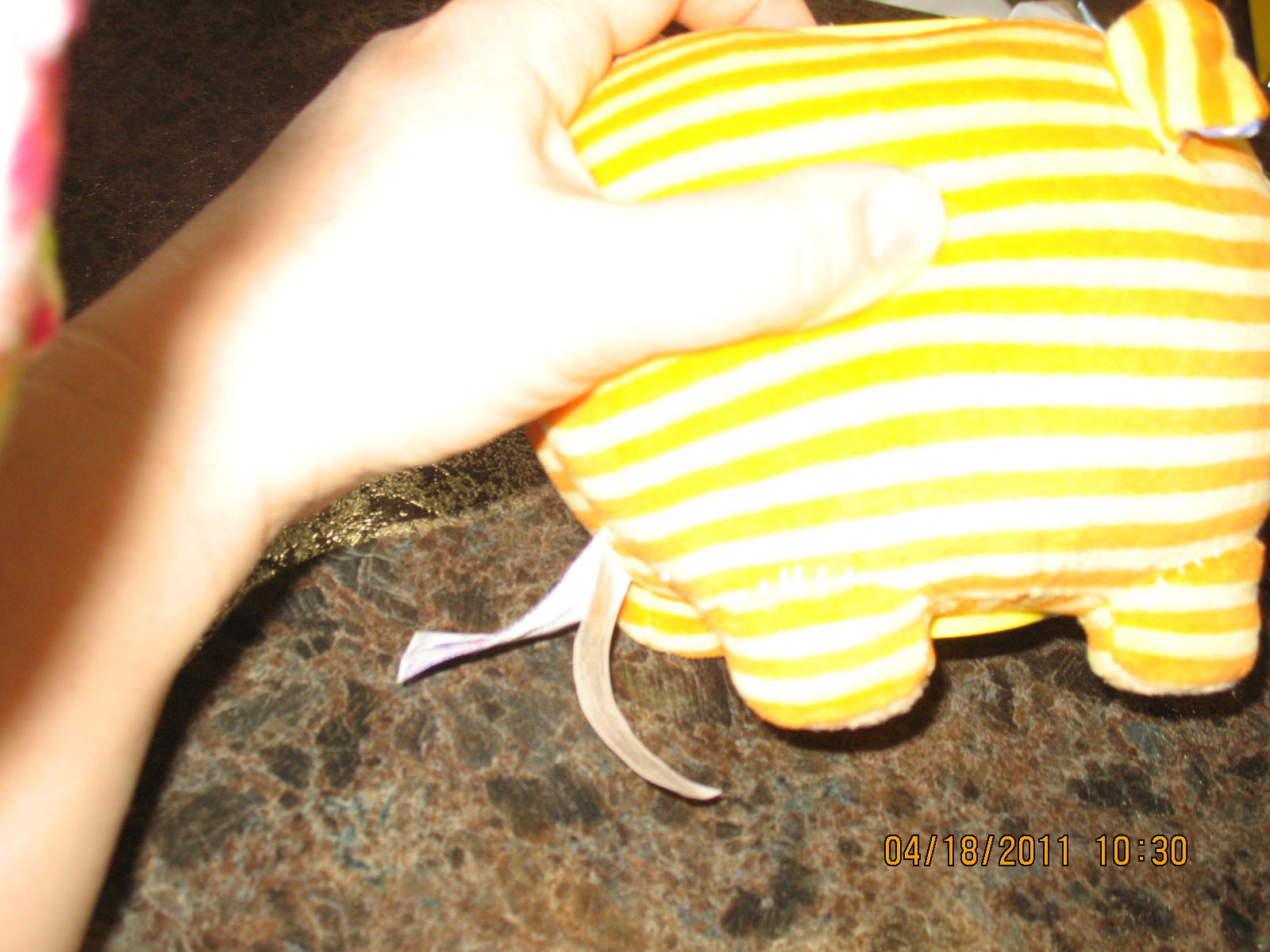Update July 2011:  Well, my 4-year-old had managed to break a tab off the removable cap on the bottom by twisting very hard on it.  I contacted Mary Meyer by e-mail and Peggy Nolan was kind enough to send me a replacement part, plus two more caps.  She informed me that they were aware of some issues with the piggy bank that my son had gotten and thought they were all pulled before distribution.  Peggy also sent me a bank with the errors corrected at no charge too.  Thank you Peggy!