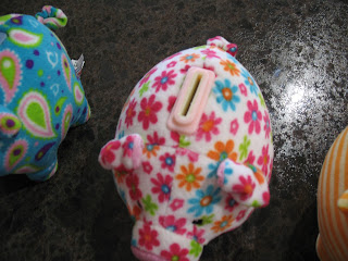 The only downfall was with my son’s piggy bank, which is the orange and yellow striped bank.  It may be hard to tell from the pictures, but two legs on the same side had loose stitches and there was a visible blob of glue near the plastic opener on the bottom.  So, just cosmetic issues.  The other two banks were fine.  My son’s had an embroidered monkey on the side and so that one was the most at $10.98.  The other two were just printed patterns.  There were fewer to select from that were boy friendly colors versus for the girls on Amazon.