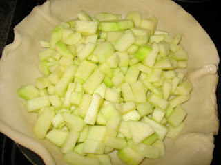 Cover zucchini with boiling water and let stand for 5 minutes.  Drain well.  Put dried zucchini into unbaked pie shell.  I like Pillsbury because it comes in sheets to easily make a shell and crust.