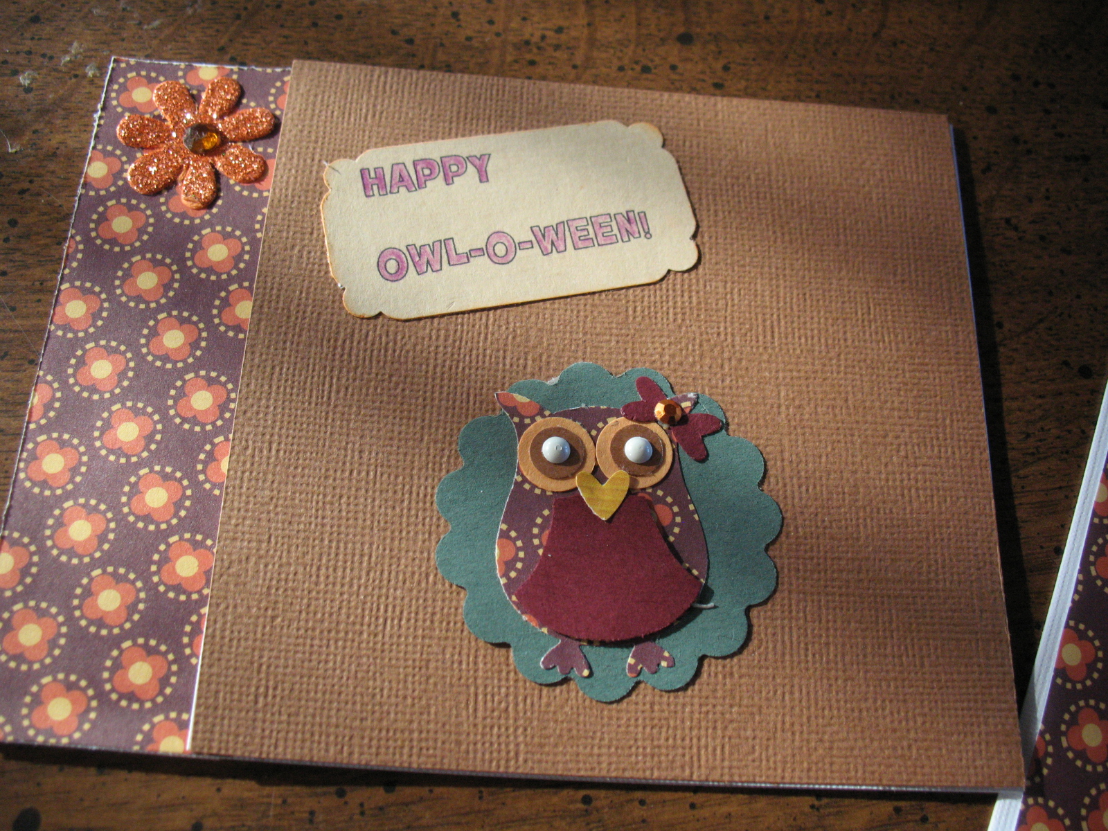 I rarely have the opportunity to create a card, but I wanted to try an owl punch that I had by Stampin’ Up and had seen someone use the cute wording of “Happy Owl-O-Ween” recently. I will warn you again, I hardly ever get time to create cards so please don’t laugh. I was doing this today while managing the girls and Caleb was napping. It was a challenge. They are so fascinated by mommy’s tools and paper, I get paper ran through the paper trimmer that I need to use and stickers stuck sometimes in odd places if I am not prepared. These were later packaged up with the mummies from another recent post and placed in brown sandwich bags that I let the girls stamp with Halloween stamps.