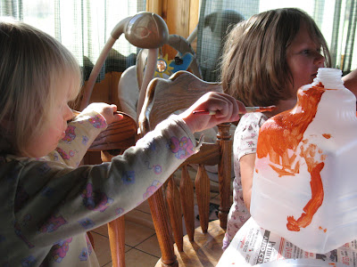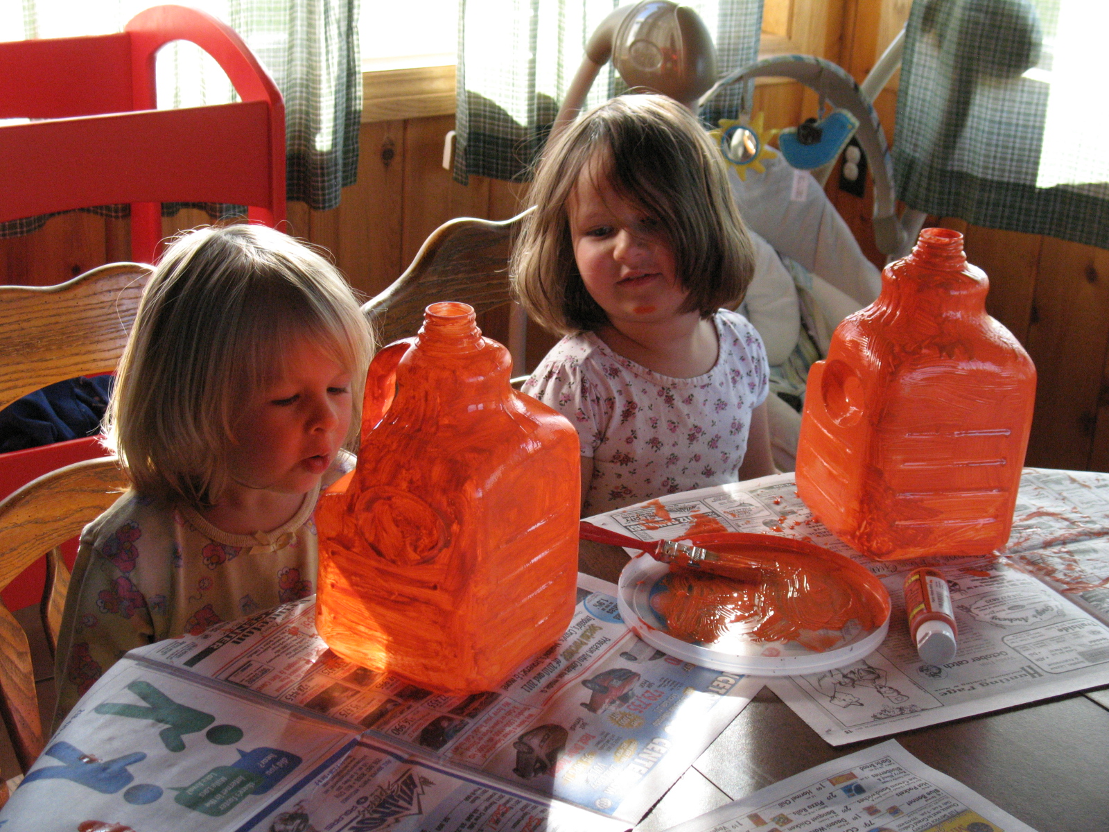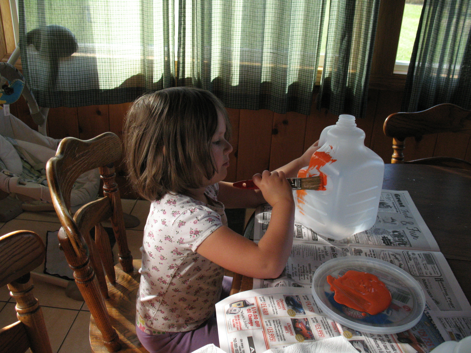 Layne using some orange craft paint to paint her “pumpkin”
