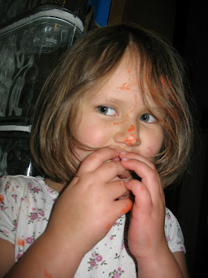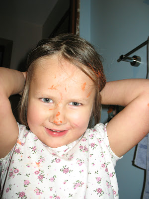 Jayden with painted tips to her hair. Yes, she has a bloody nose. We painted and then went out for a walk to pass the time as the milk jugs dried. She was skipping along on the tar road and fell.