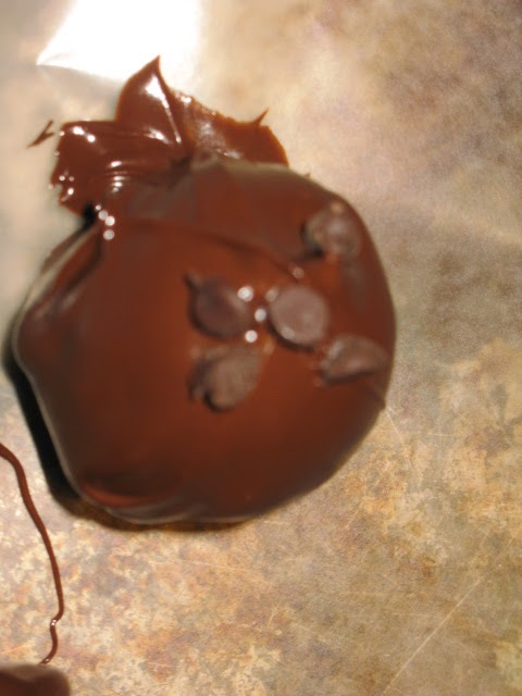 The recipe said to use a toothpick to dip. I had a problem with mine almost wanting to come off the toothpick so I resorted to a fork to push along in chocolate and then to hover over and let the excess chocolate drip off