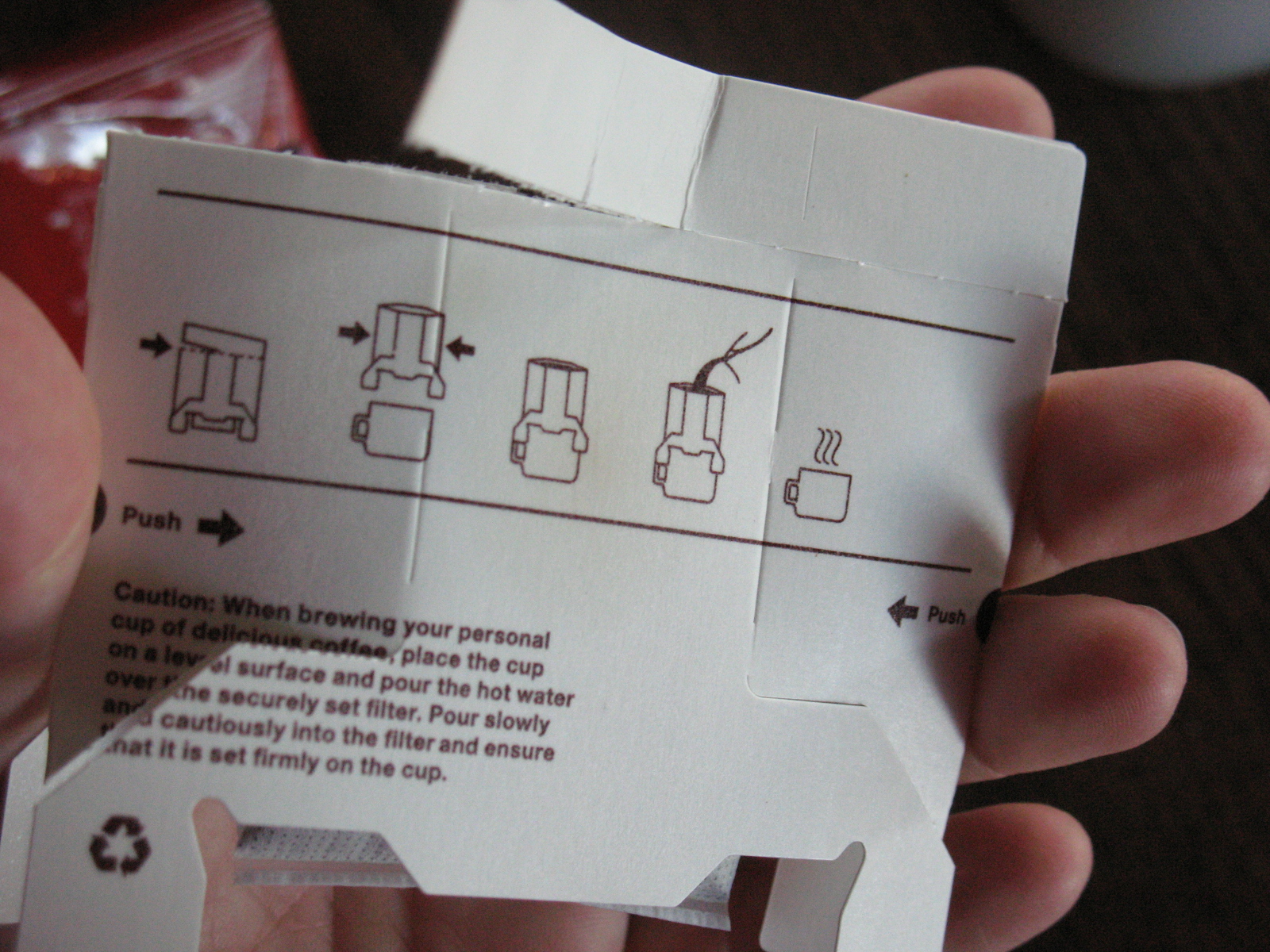 It has a perforated tab/cut to tear off the top of the single cup drip pack.  You want to make sure you use this so you don’t damage the packaging underneath.