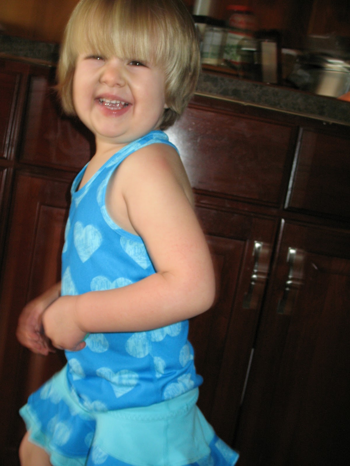 Jayden, my 3-year-old, is a busy bee. I don’t know if you can tell from the background, but this is her running around in the house. She is sporting the KeepUrCool Racer II and Twirl It Up Skirt. These two pieces are made of luon® fabric so they are breathable and have a 4-way stretch.