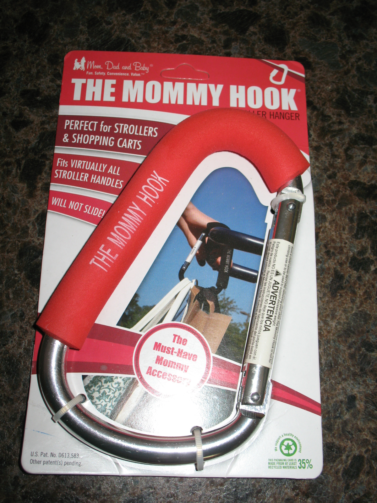 The Mommy Hook is made by Mom, Dad and Baby, a U.S. based company. The Mommy Hook clips onto the handle of almost any stroller or shopping cart. It creates a place to hang all the gear that travels with on-the-go families with young children.