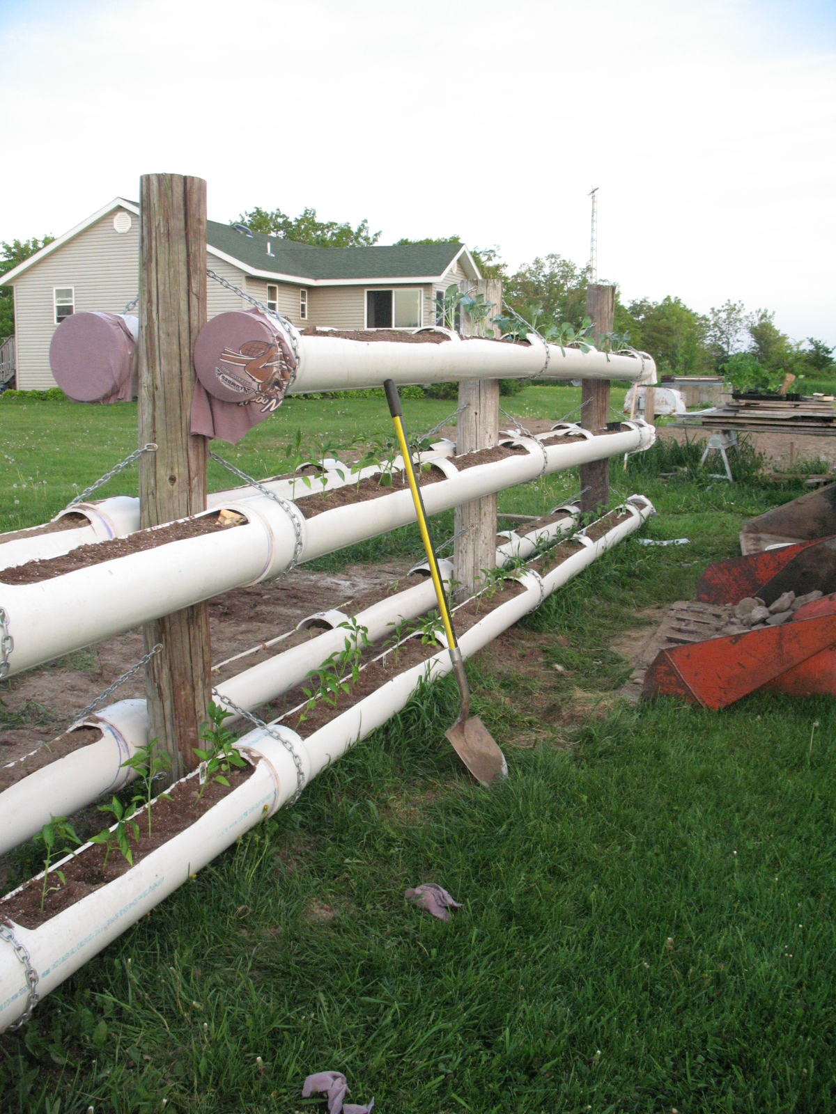 | New project this year. PVC used as vertical planters. We will see how this yields. We put peppers, kale, swiss chard, cabbage, parsley, peas, and lettuce in it. |